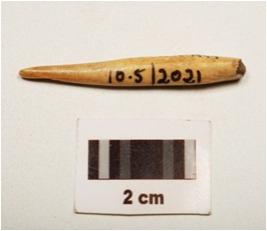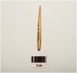 | Description / विवरण | A bone point, with sharp pointed end another end broken, with polished surface and circular cross section. |