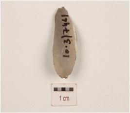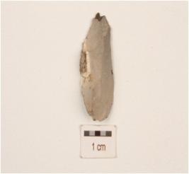 | Description / विवरण | A blade made on chert, use-wear marks on working edge, flake scars on dorsal side, diffused bulb on ventral side. |