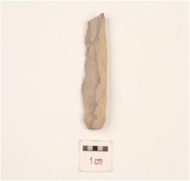 | Description / विवरण | A blade made on chert, use-wear marks on working edge, triangular in section, bulb on ventral side. |