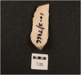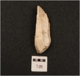 | Description / विवरण | A blade made on chert, partly broken from one side, use-wear marks on working edges, ridges on dorsal side, trapezoidal section. |