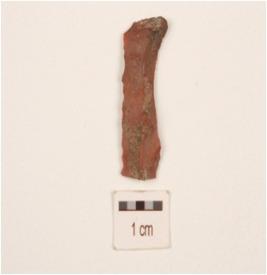 | Description / विवरण | A blade made on chert, use-wear marks on working edges, triangular in section, ridge on dorsal side, prominent bulb on ventral side. |
