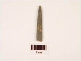 | Description / विवरण | A stone long point with polished surface, pointed one end other end broken, plano convex in section and grey in colour. |