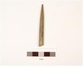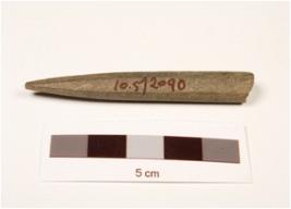 | Description / विवरण | A stone long point with well polished surface, pointed one end, other end broken, circular in section and grey in colour. |