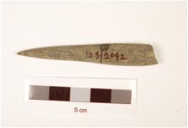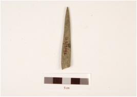 | Description / विवरण | A stone long point with smooth surface, pointed one end, partly chipped off surface and rectangular in section. Grey in colour. |