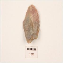 | Description / विवरण | A blade made on chert, ridge on dorsal surface, use-wear marks on working edges, triangular in section, prominent bulb on ventral side. |