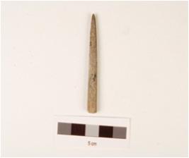 | Description / विवरण | A stone long point with polished surface, broken one end, other end pointed, grey in colour and circular in section. |