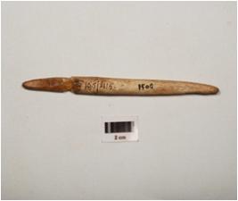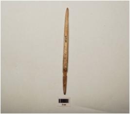 | Description / विवरण | A bone knitter, partly polished surface with pointed ends, thick from the middle, light brown in colour and rectangular in section broken and mended. |