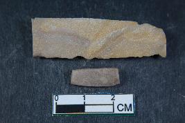 | Description / विवरण | Fragments of blades having one dorsal ridge in smaller one and two dorsal ridges in larger one with bulb of percussion in one of them.They have smooth surface. |