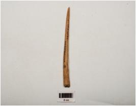 | Description / विवरण | A bone point, partly polished and uneven surface, one pointed end, partly broken from both ends and brown in colour. |