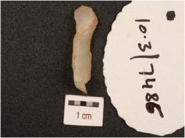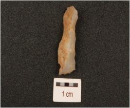| Description / विवरण | A blade made on chalcedony, use wear marks on working edges, triangular in section. |