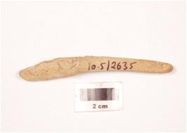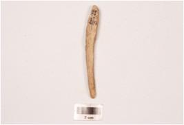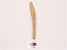 | Description / विवरण | Point with one end pointed has a square cross section, part of hollow space of the bone narrow visible, polished surface and cut marks visible on one end. |