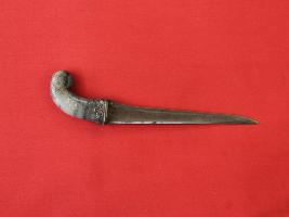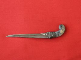 | Description / विवरण | It is a Peshqabz. Blade is straight and pointed. Edge is sharp and tip is thickened. A little curved hilt is fitted with a big block of jade which is curved with floral design. There is a carved silver cap at the starting of the hilt. |