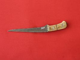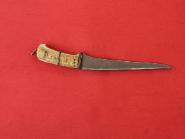 | Description / विवरण | It is a Peshqabz. Blade is made of iron alloy. Blade is a little curved it is wider at the root and tapering towards the tip. Edge is very sharp and back edge is decorated with floral carvings near the root. Root of the blade is damascened in gold. Hilt is filled with four ivory cheeks. Metal part of the hilt is also damascened in gold. There is a perforated loop at the tang button. |