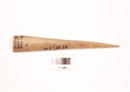 | Description / विवरण | Bone point with one end pointed and other end broad, polished surface and cut marks visible on surface on one side. |
