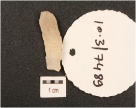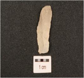 | Description / विवरण | A blade made on chert with a mid ridge, use-wear marks on working edges, triangular in section, prominent bulb on ventral side. |