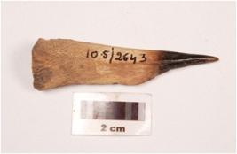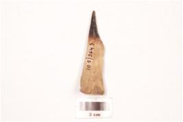 | Description / विवरण | Bone point with the pointed end charred, other end broad and intact a middle ridge visible on surface on one side and polished surface. |