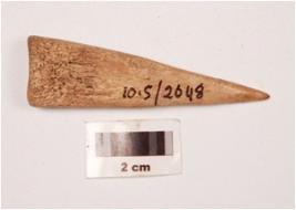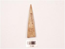 | Description / विवरण | Bone arrow head with a pointed end and other end broad, polished surface and cut marks visible on surface. |