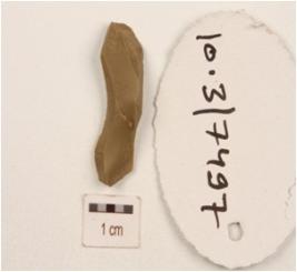 | Description / विवरण | A blade made on chert with two ridges on dorsal surface, use-wear marks on working edges, trapezoidal in section. |