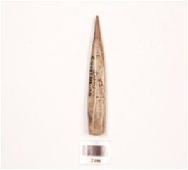 | Description / विवरण | A bone point with a broken pointed end, smooth surface, some cut marks visible on surface, rectangular in cross section and a crack visible on surface. |