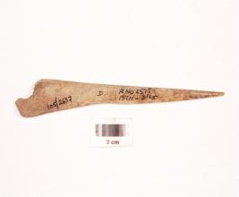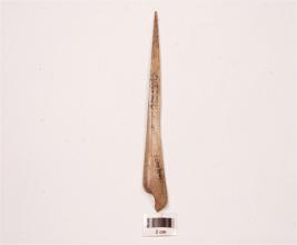 | Description / विवरण | Bone point with a pointed end polished surface broad at other end, slightly broken at other end. A slight bend at middle on side visible and cuts marks on surface. |