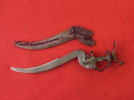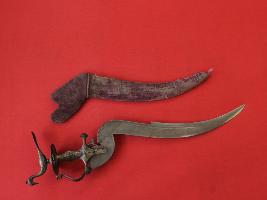 | Description / विवरण | It is a Tanjoor made of iron. It is recurved, shiny, and sharp double sided blade. P.S.M is engraved on the left side of blade on the top of curve. There is a wild animal made of iron fixed on the posterior back side of blade. The hilt is made of iron with goldish coating, hilt has on knuckle guard. The pommel is in round shape which has attached an iron made bird on its outer surface. The sheath of the Tanjor is made of wood covered with cloth. |