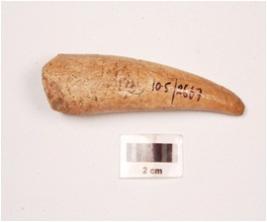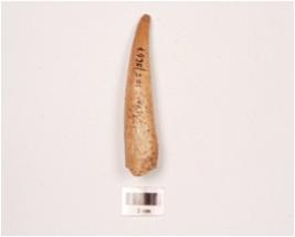 | Description / विवरण | Horn point with a polished surface, pointed at one end and broad at other a crack extending from the tip to base is visible. |