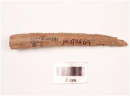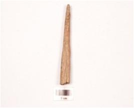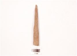 | Description / विवरण | Bone point with one end pointed other end broad, roughly rectangular cross section, polished surface and cut marks visible. |