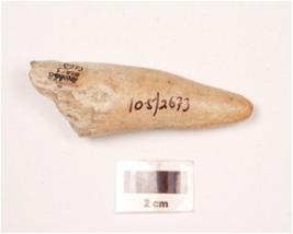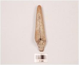 | Description / विवरण | Horn point with a polished surface, slight weathering marks visible on surface, one side used for polishing pointed at one end and broken at other end. Vertical crack visible on surface. |