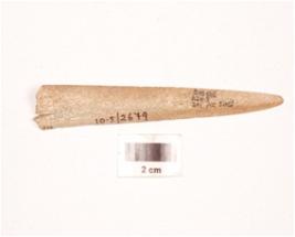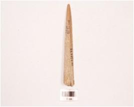 | Description / विवरण | Bone arrow head with an incised chevron design on it. Two prominent ridges on surface visible, polished surface and slightly weathered and pointed at one end broad at other. |