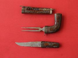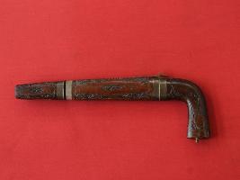 | Description / विवरण | It is a dagger case containing two different daggers. Dagger A is simple its blade is little curved and pointed with sharp edge. Handle is carved in floral designs. There is a circular brass plate with a loop fitted at the starting of the handle. Dagger B is unequally made in a pistol shape. Handle is in butt shape and carved beautifully. Blade is bifurcated and very piercing. A brass plate with a button is present at the bottom of the butt handle. There remains a beautifully carved wooden shaft with a brass made spiky lock on each sides. |