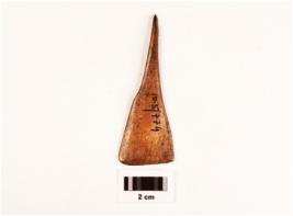 | Description / विवरण | Bone scrapper, intact, flat from one side other side pointed, smooth and polished surface, incised lines on one side, brownish lustrons. |
