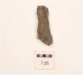 | Description / विवरण | A blade made on end struck chert flake, flake scars present on dorsal side, bulb of percussion on ventral side, prepared platform on proximal end, partly retouch cutting edges, with use wear marks. |