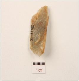 | Description / विवरण | Flake made on end-struck quartz flake, cortex on platform, use-wear marks along cutting edge. |
