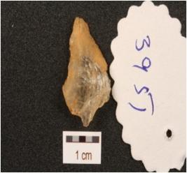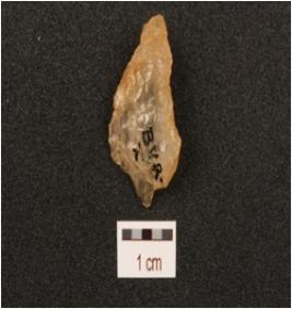 | Description / विवरण | Flake made on quartz, flake scars on dorsal surface, positive bulb on ventral surface, use-wear marks along cutting edges, smooth surface. |