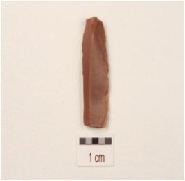 | Description / विवरण | A blade made on chert with a single ridge, bulb on the ventral side, use wear marks on the cutting edge, smooth surface, triangular in section. |