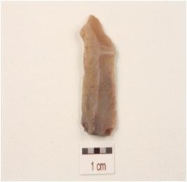 | Description / विवरण | A blade made on chert with a single ridge, use wear marks on cutting edge, broken at both the ends, triangular in section. |