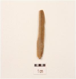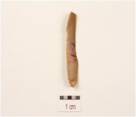 | Description / विवरण | A blade made on chert with a single ridge, diffused bulb on the ventral side, use wear marks on cutting edge, trapezodial in section. |