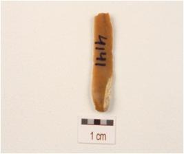 | Description / विवरण | A blade on chert with double ridge, diffused bulb on the ventral side, use-wear marks on cutting edge, trapezodial in section. |