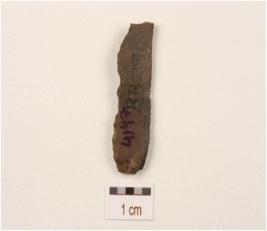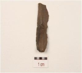 | Description / विवरण | A blade made on chert with double ridge, partly chipped off diffused bulb, use-wear marks on the cutting edge, trapezodial in section. |