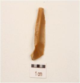 | Description / विवरण | A blade made on chert with single ridge, bulb on the ventral side, use-wear marks on the cutting edge, trapezodial in section. |