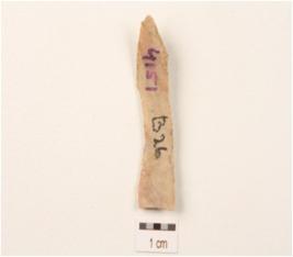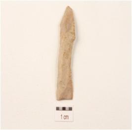 | Description / विवरण | A blade made on chert with single ridge, use-wear marks on the cutting edges, broken from proximal end, pointed at distal end, trapwzodial in section. |