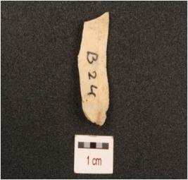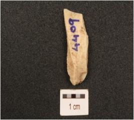 | Description / विवरण | Parallel sided chert blade, distal end is broken, prominent bulb with striking platform, use wear marks on both working edges. |