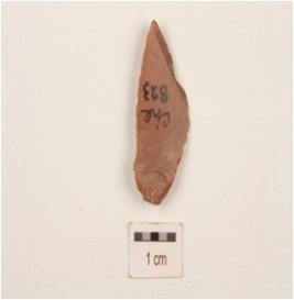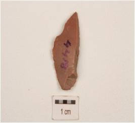 | Description / विवरण | Parallel sided chert blade, distal end broken, chipped off bulb with prepare platform, use wear marks on both working edges, a straight vertical ridge on dorsal surface. |