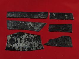 | Description / विवरण | Trench C- 8 to D- 8, Pit 10 sealed by layer 3 These are six broken piece of blade. Having sharp edges from its both sides. Surface is rough and appearance is black. |