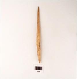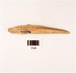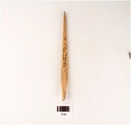 | Description / विवरण | A sharp bone point, proximal end intact, chipped off distal end, polished surface. |