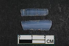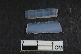 | Description / विवरण | Fragments of blades with two dorsal ridges having smooth surface. Shorter fragment has length equivalent to 2.1 cm. |