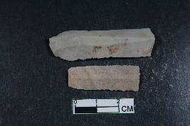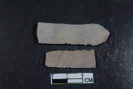 | Description / विवरण | Fragments of blades with two dorsal ridges having smooth surface. Shorter fragment has length equivalent to 3.2 cm. |