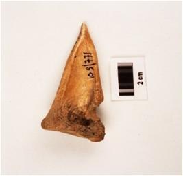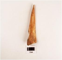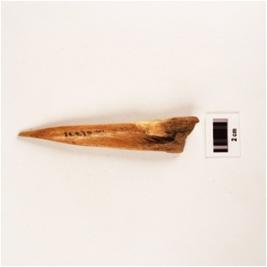 | Description / विवरण | Bone point, point slightly damaged and other end thick, flat from one side other side grooved. |
