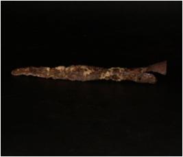 | Description / विवरण | Iron hoe, partly broken, flat from one side, hollow handle, pointed end, rough surface, rusted. |