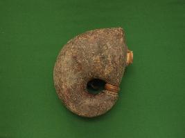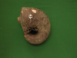 This a gun powder flask made of animal horn, leather is covered over the horn, an ivory spout is made on the broader end of the flask. Shape is round. Narrower end in joined with the broader one by the use of another ivory piece.Three loops are with it which were used to hold it properly.